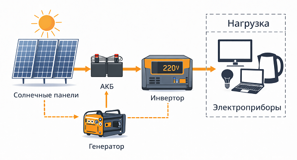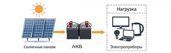 Типичная схема для автономных систем: панели → MPPT-контроллер → АКБ → инвертор → нагрузка.